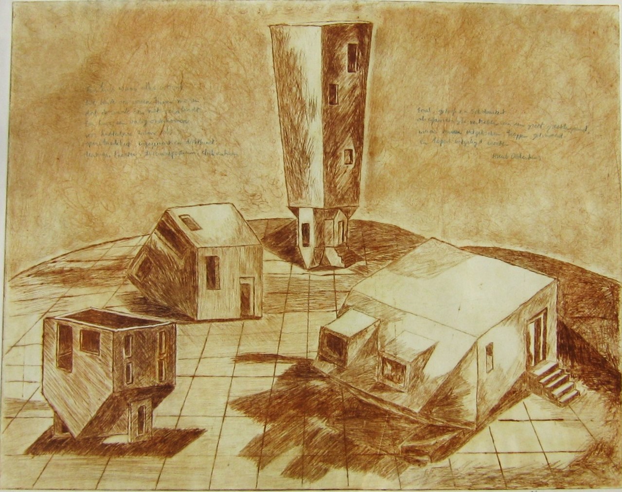 Meer diepdruk Links: Verschijnen, diepdruk met carborundumschildering 1/3, 24×18 cm. Rechts: Ibis, geschildere suikerets, 1/3, 18×24 cm. Huis waar alles woont, diepdruk droge naald, 1/3, 40×55 cm. vorige volgende